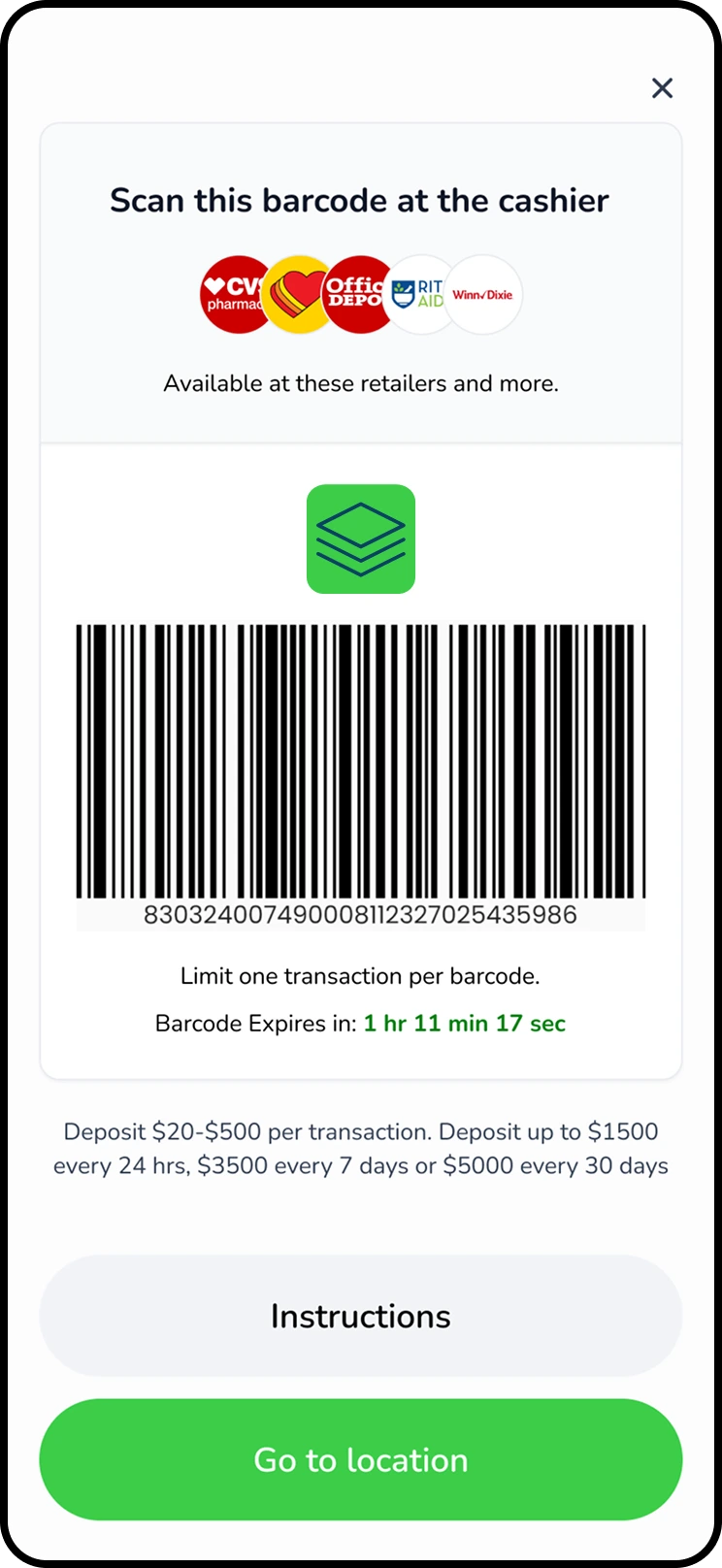The app will generate a barcode. Head to the register at your chosen location and have the cashier scan it. Pay the cashier the exact cash amount you entered earlier.